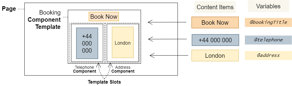 For example, in the diagram below, a Book Now Component Template is used with an Address and Telephone Component inserted as methods of contact. However, these could be replaced with other methods of contact, such as Email and Social Media instead.