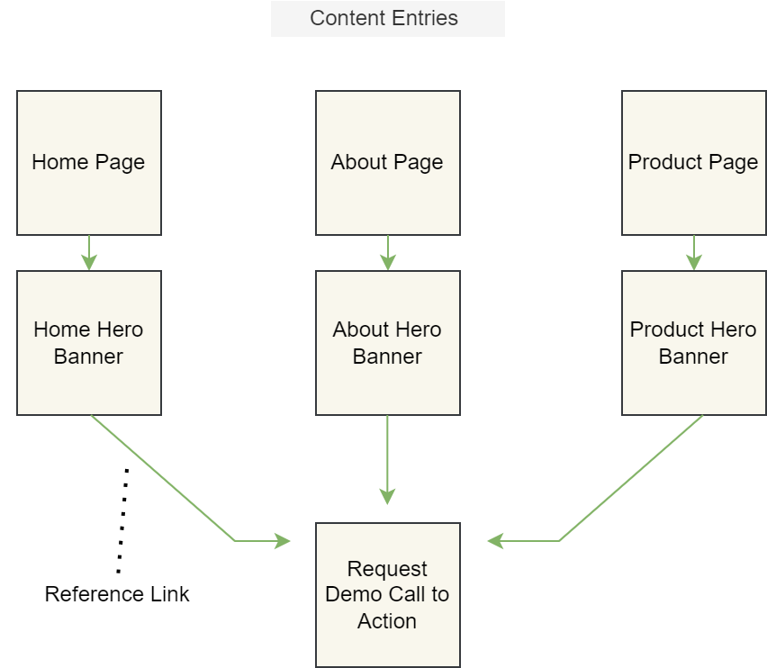 In the below example, three different ‘hero banner’ Content Entries use the same ‘call to action' for requesting a demo.