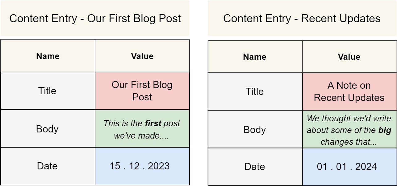 For blog posts, standard fields such as title, body, and date can be set up with value types like Text and Date Time. Content editors then fill and adjust the corresponding Content Entry Fields with values that match the predefined type.