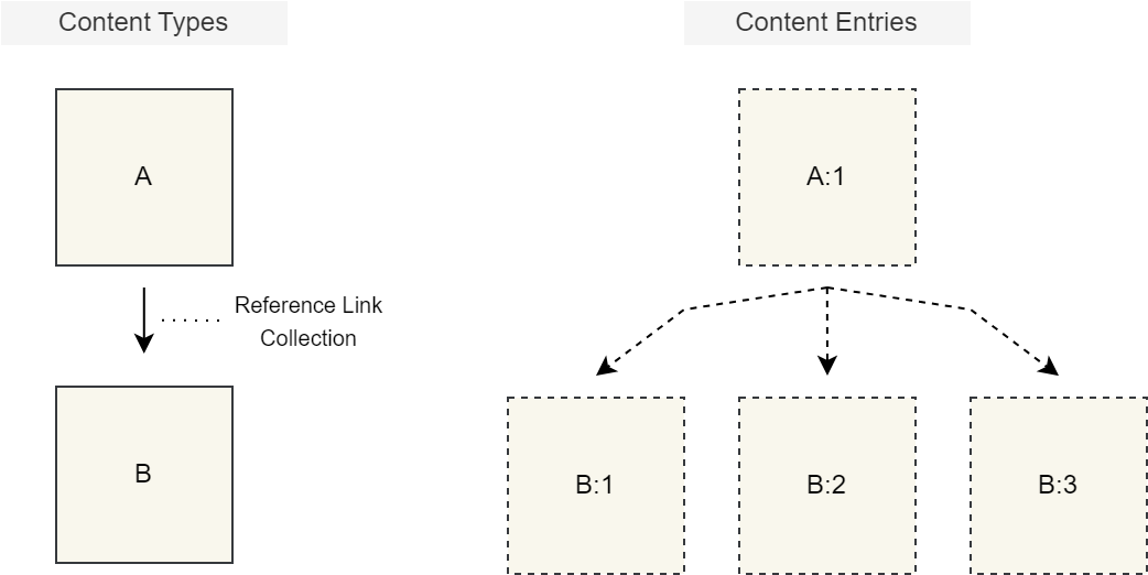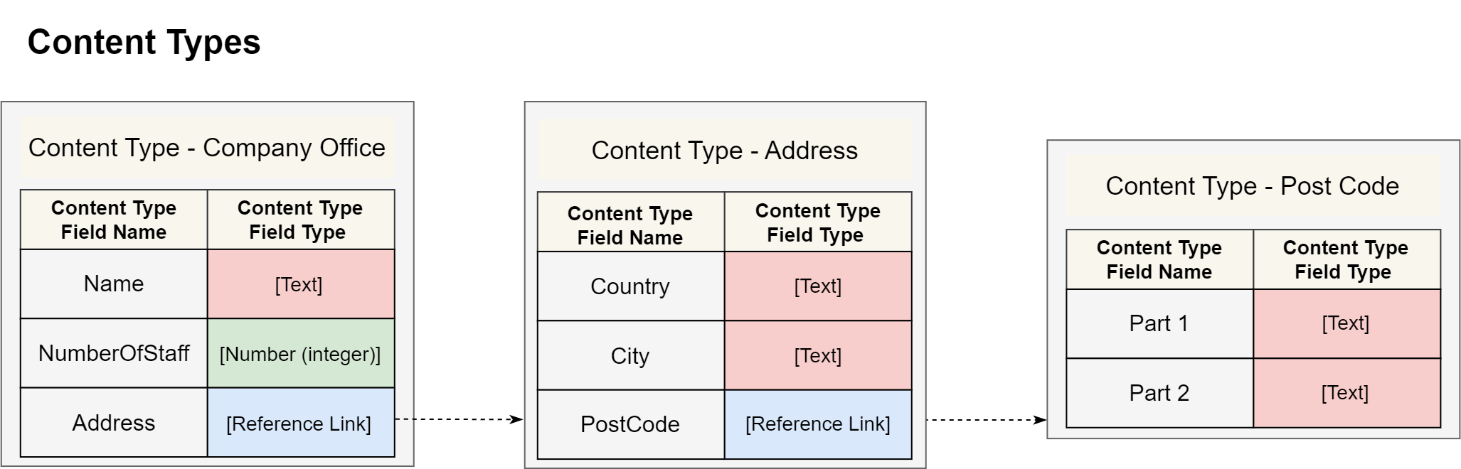 Content Types can be linked together using a special field called a Reference Link. This allows you to compose new Content Types from existing ones. Doing so creates a chain of Content Types (and this permits their Content Entries to be similarly linked). However, keep in mind that you can only link up to 10 Content Types and circular references are not allowed.
