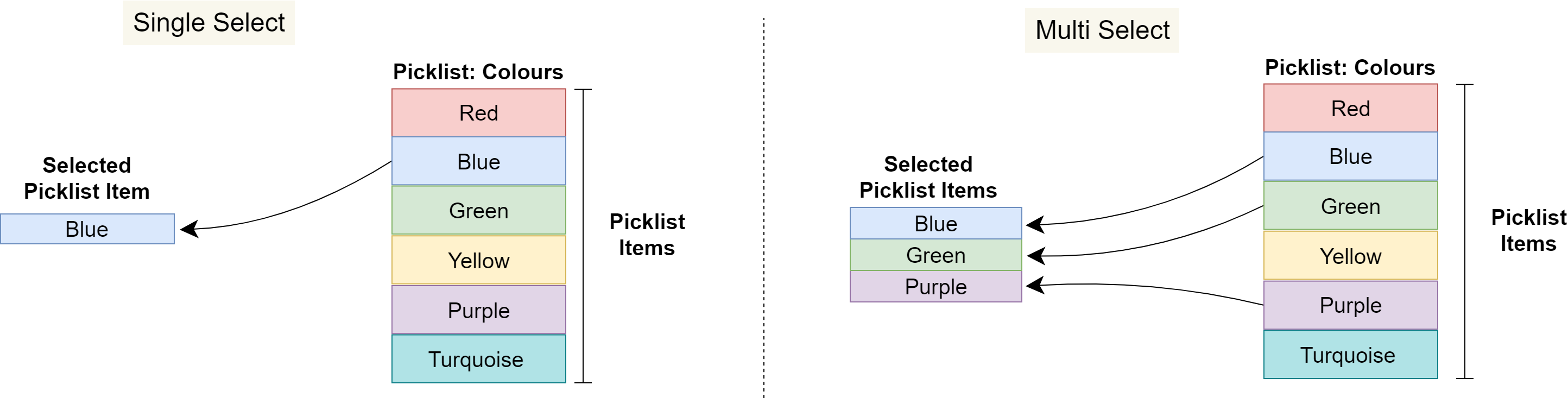 In the following diagram, the colours displayed on a Page are determined by the selected Picklist Items.