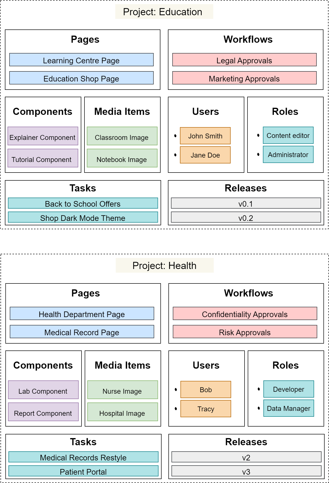 The following diagram shows how two Projects can be used to manage different sets of content.