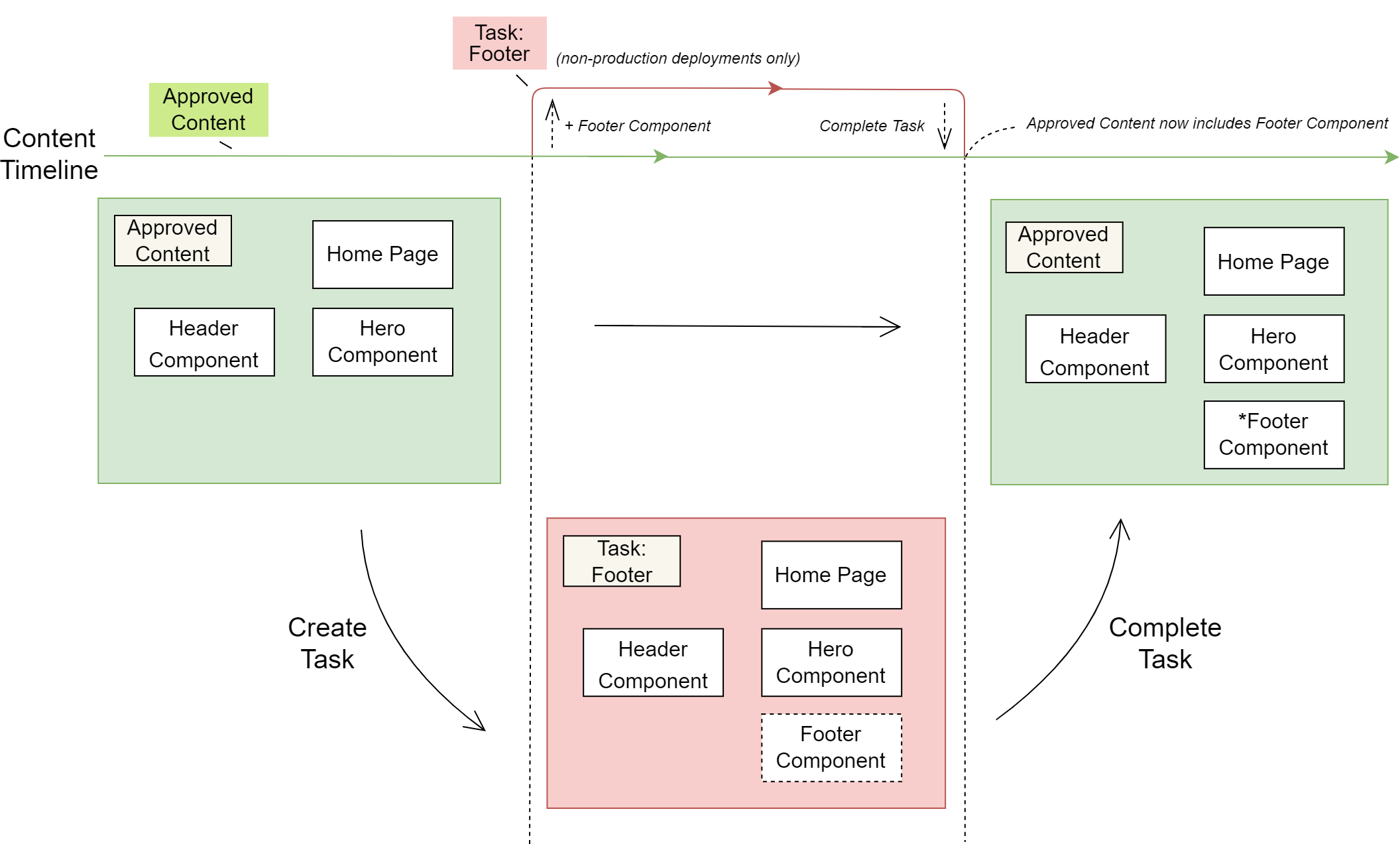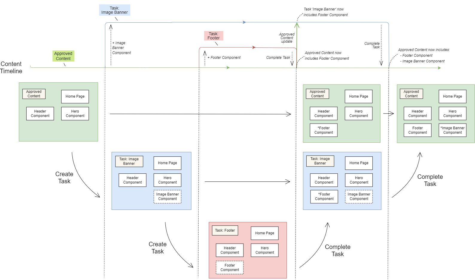 When the Footer Task (red) is completed, both the Approved Content (green) and Image Banner Task (blue) are updated with the Footer Component. The Image Banner Component is then added to the Approved Content when its Task is completed.