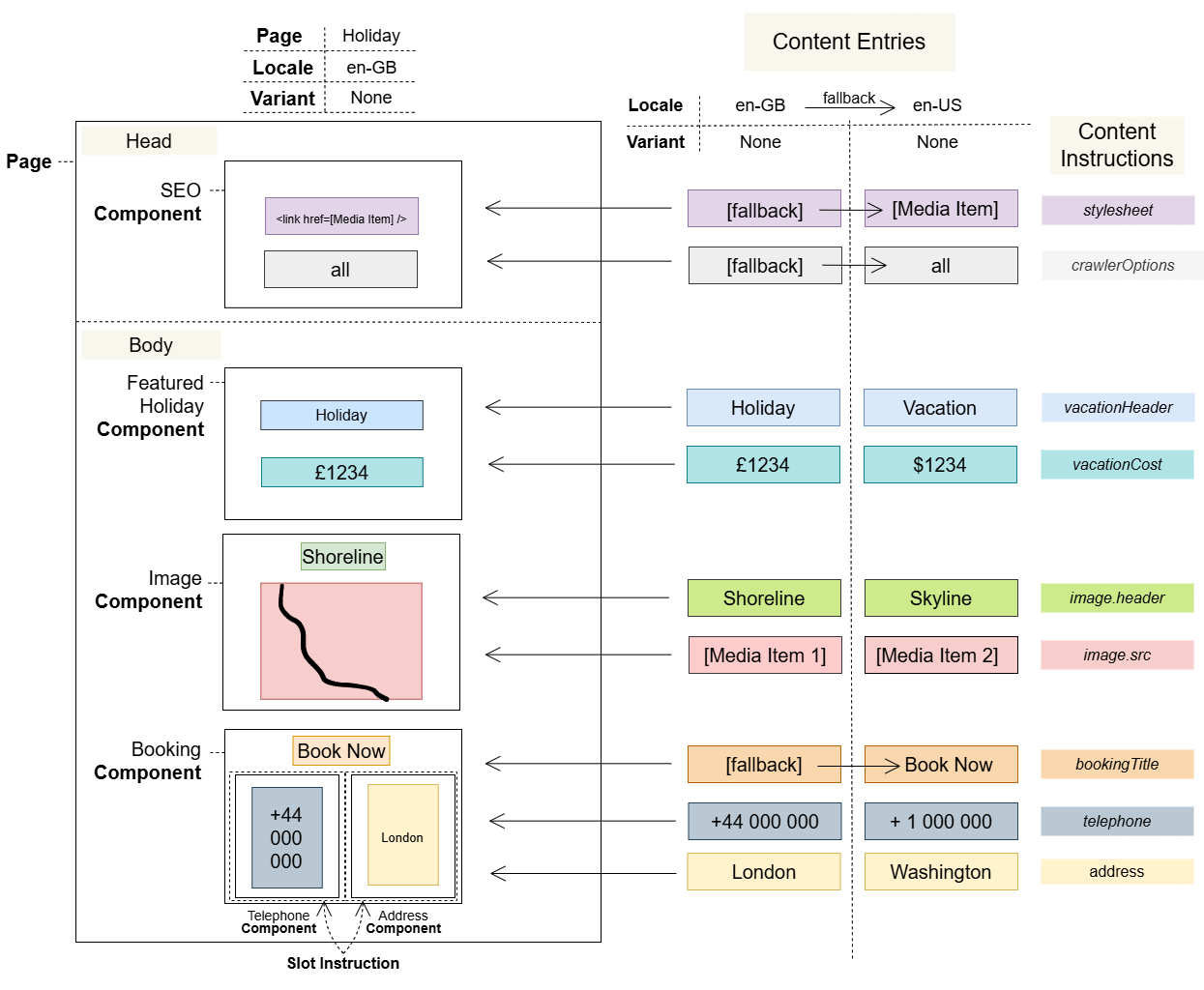 Content Entries are always associated with both a Locale and a Variant via Component Configuration for a Page.