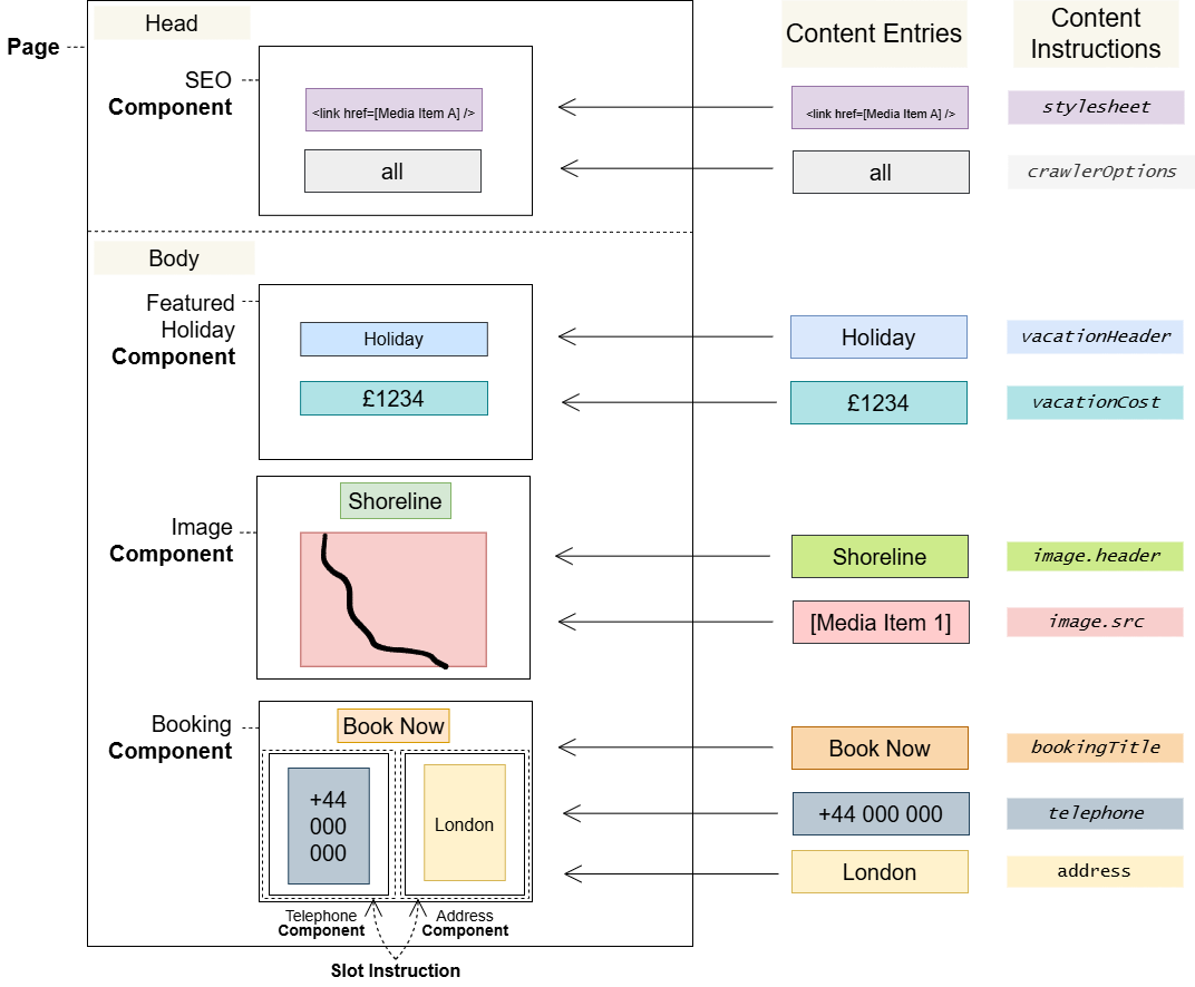 The following diagram shows how Pages are composed of Components, with values from Content Entries inserted where Content Instructions have been defined.