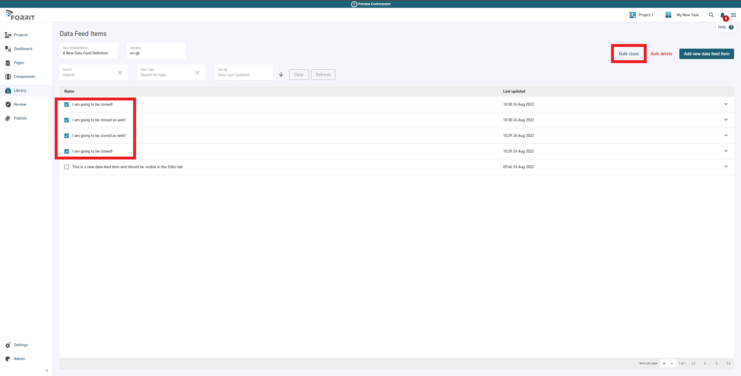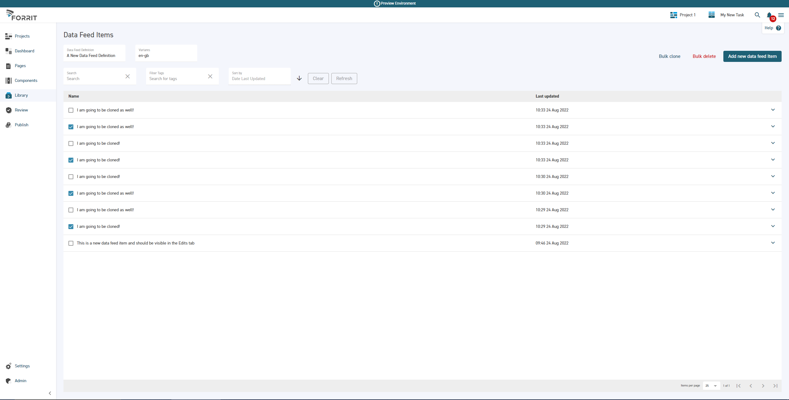 You now have the ability to clone multiple Data Feed Items at once - a feature we call Bulk Cloning. This is especially powerful as it allows you to clone Data Feed Items to a different variant from where it was created - allowing easy content population when introducing new variants to your project. To do this, follow these steps: