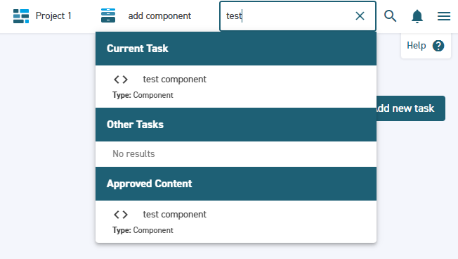 The search feature will look through the entire system for any item matching a given word. It will find any editable item in the system with that name or content, or that has a matching tag. All tasks will be searched, including the current one.