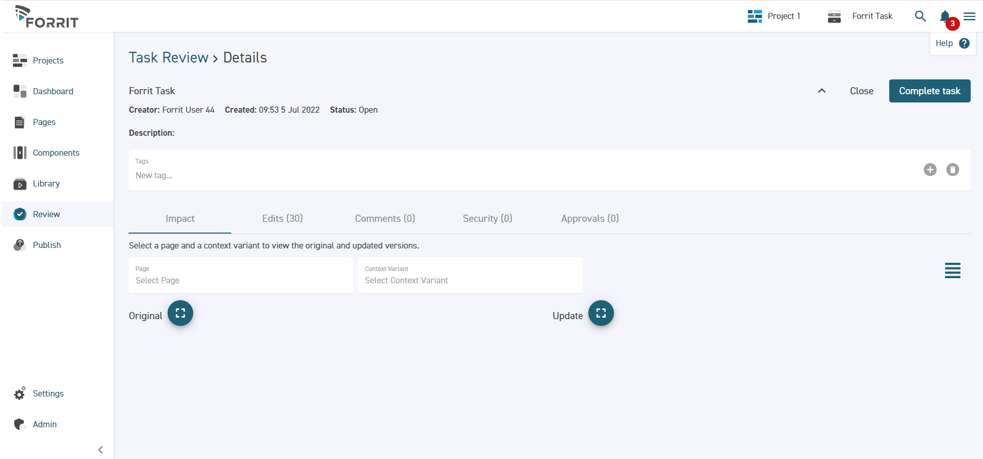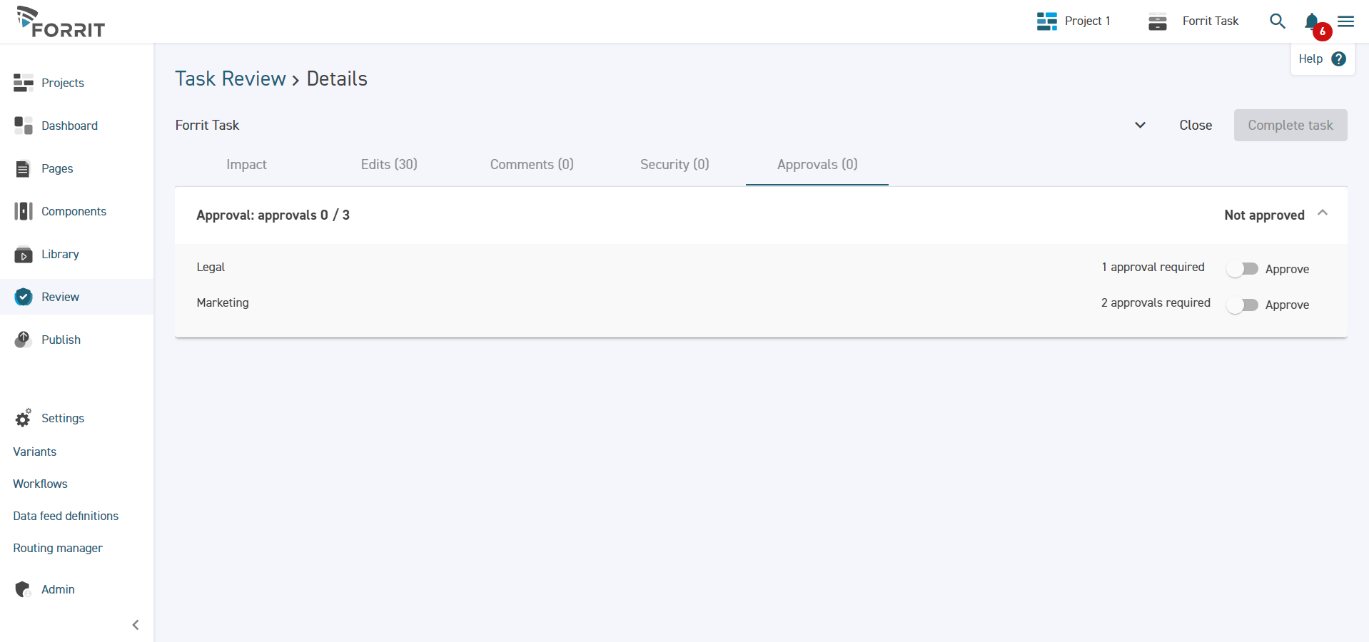 Once the changes to a task are ready, it must be approved by another user before the task can be completed.