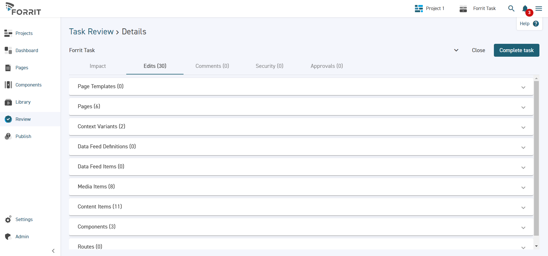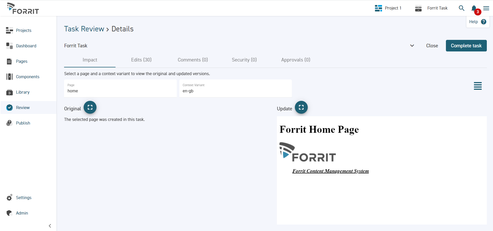 Click Complete task. The changes in the task will be merged into the approved content and will become visible to other users. If those users are currently using the CMS, they may be notified that the content they are viewing has updated, and they may need to reload the CMS in the browser to fetch the latest changes.